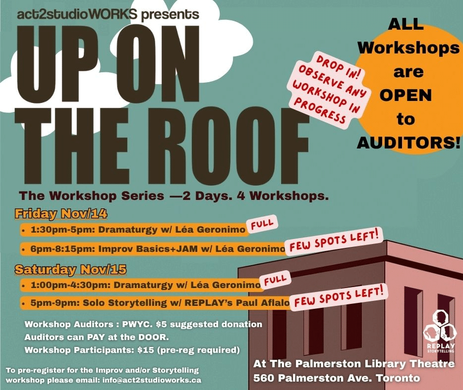 Second 3 plays are on Nov 15 from 1:00 to 4:30pm, followed by a Solo Storytelling Workshop with REPLAY’s Paul Aflalo.