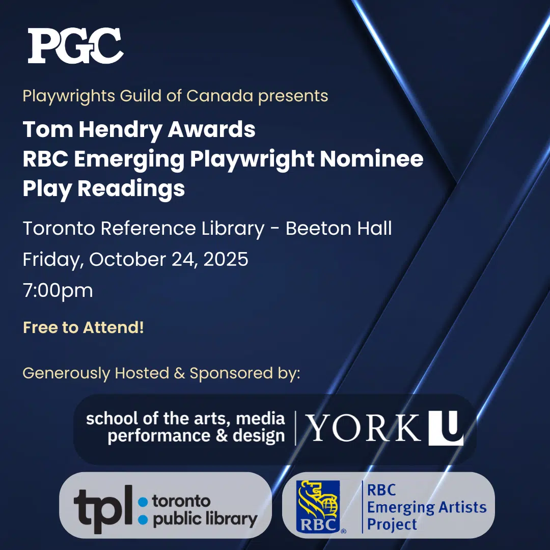 The Tom Hendry Awards RBC Emerging Playwright Nominee Readings will be hosted by the Toronto Reference Library in partnership with York University’s School of the Arts, Media, Performance & Design.